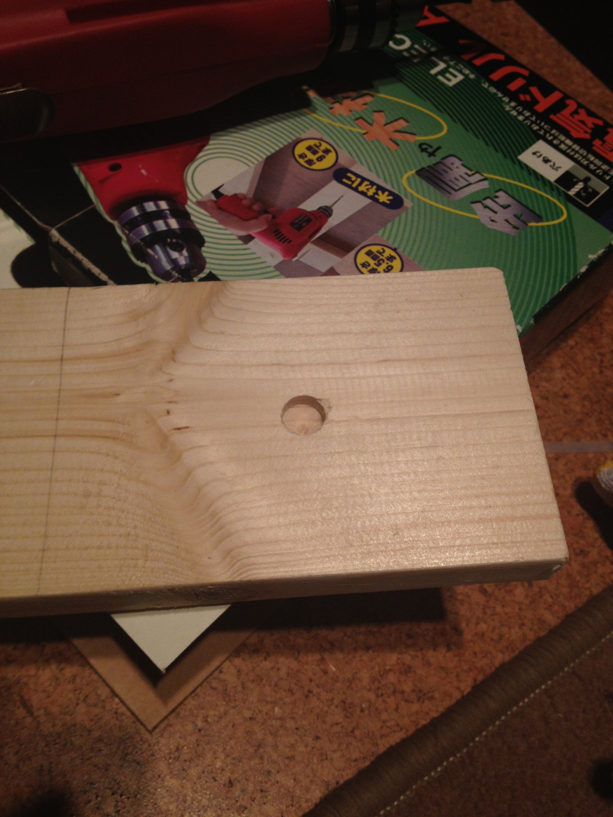 板に11.5mmの穴をあけました。貫通はさせていません。深さはだいたいこれぐらいだろうな感じです。