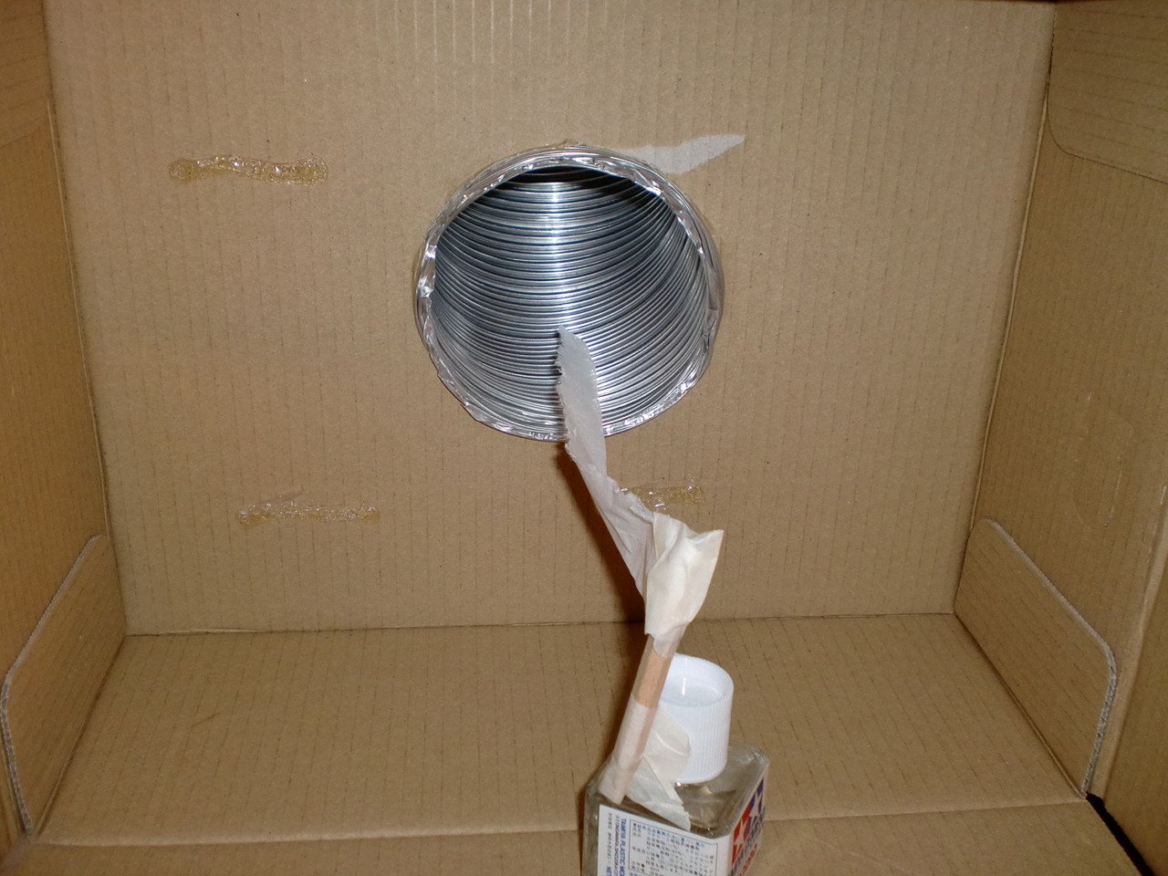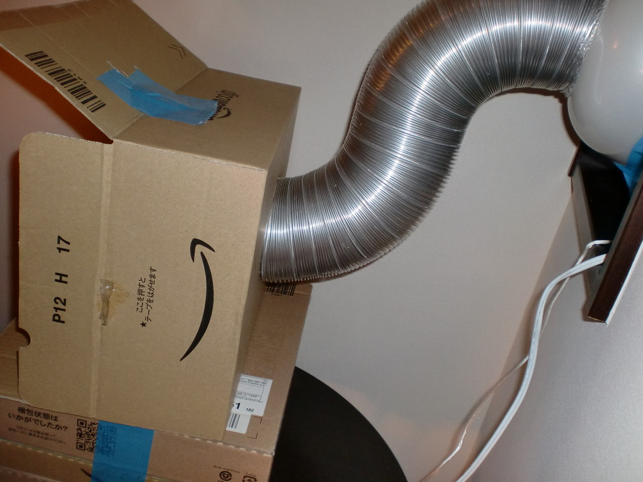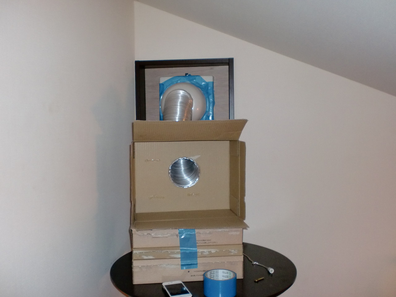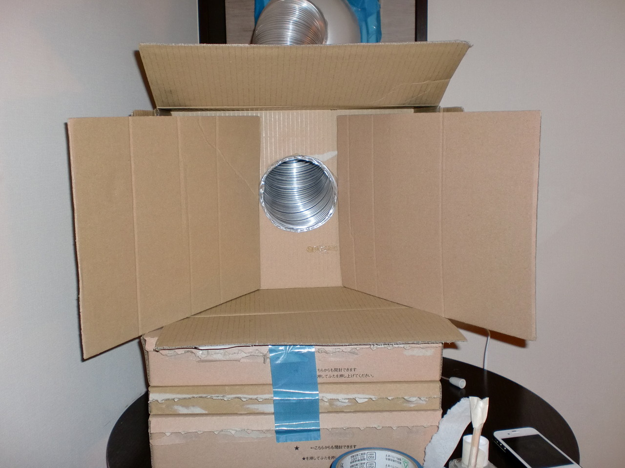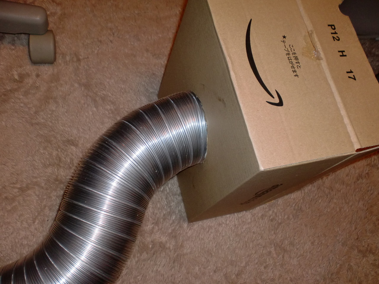 ダンボールに穴をあけ、ダクトを突っ込んだだけです。