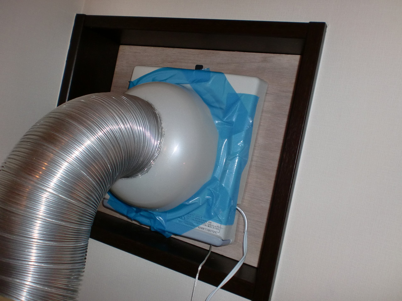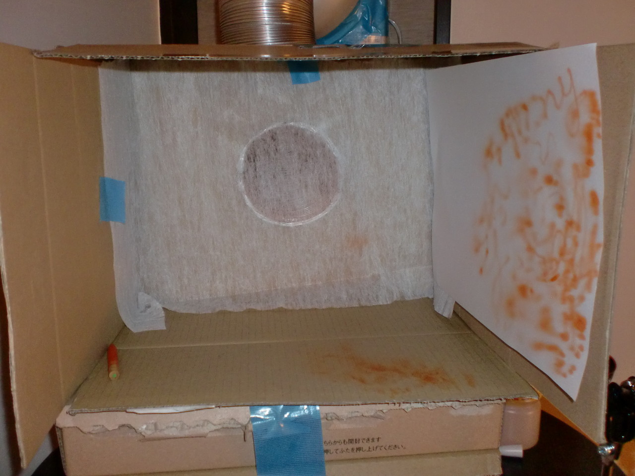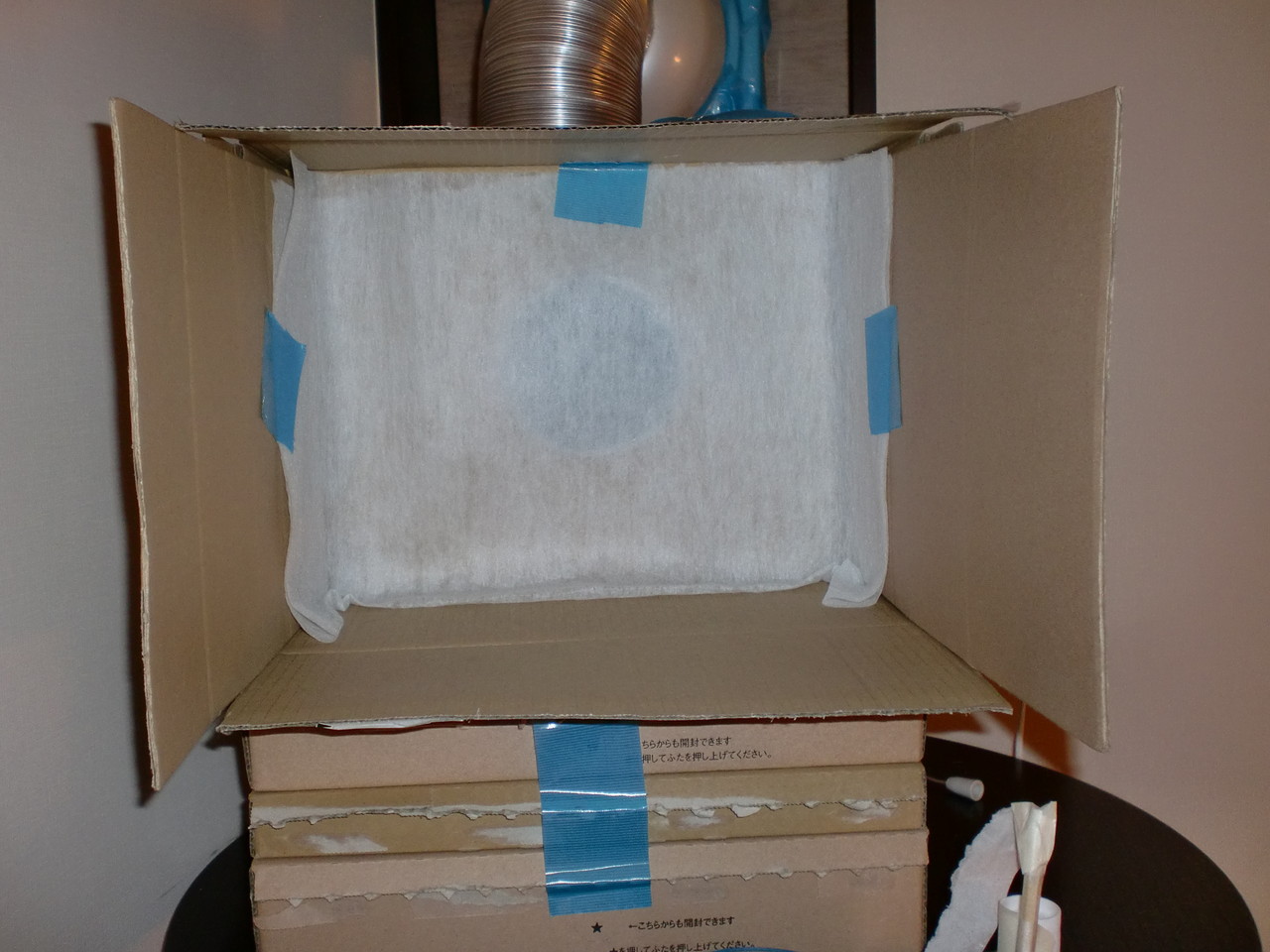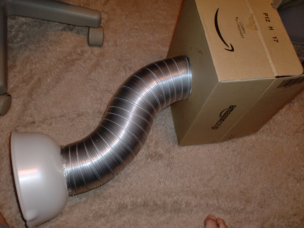 ダンボールに穴をあけ、ダクトを突っ込んだだけです。