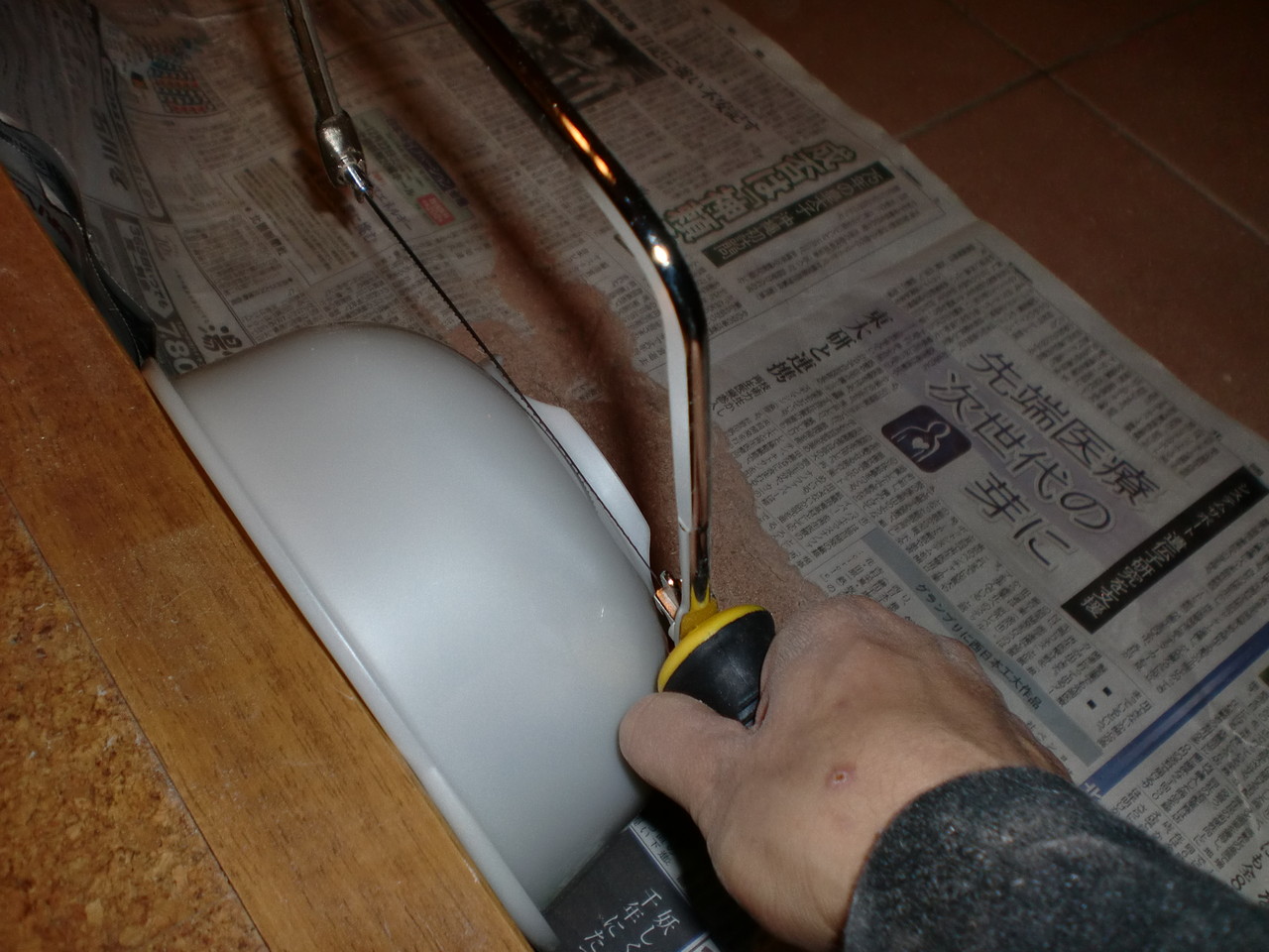 要らない部分を切り落としたらキリで穴を開け、糸ノコで円を描くようにギコギコと。