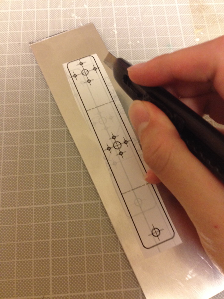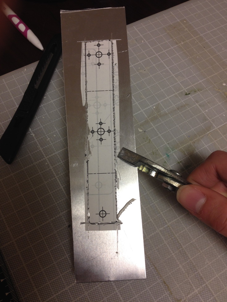 ・製作実際に作っていきます。まずサーボブラケットを印刷した紙を切ってアルミ板に貼っていきます。紙をアルミに貼るのにはスプレーのりを使いました。