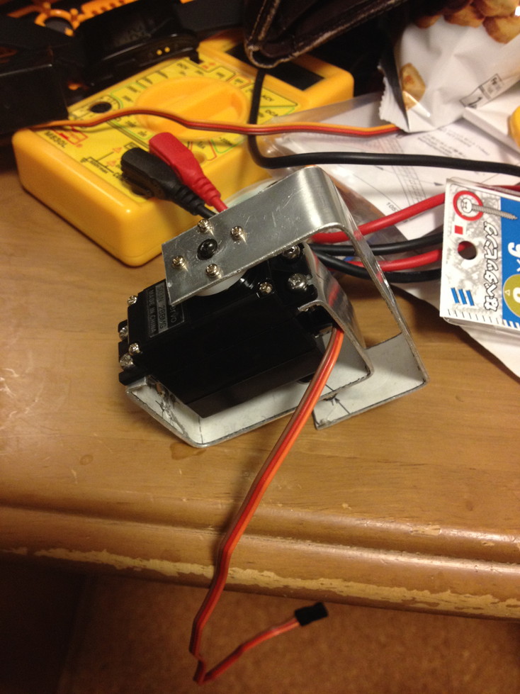 (撮影後、別のサーボ用(S03NなのにS03T)のアームを取り付けていたことが判明。10mmも長く出来上がってしまっておかしいなと思いつつ取った写真です。なので実際はもうちょっと短いアームです。この時はわざわざ10mm長い組ネジを買いに行きました・・・)