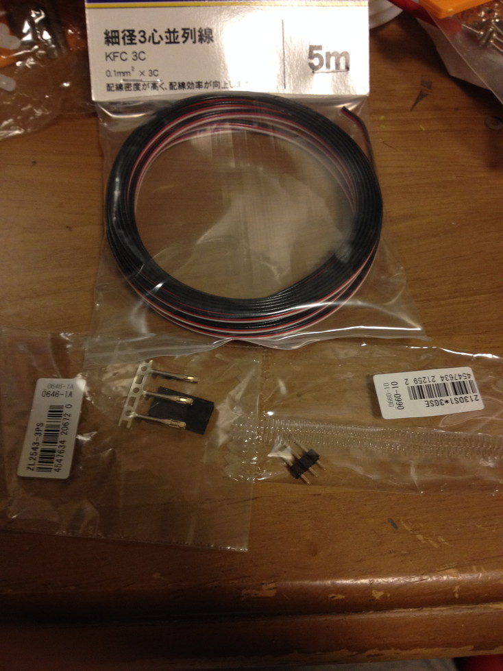 線とソケットを何セットか買ってきてハンダ付けしました。この線はサーボのフタバ配列と同じ色だったので作った後もわかりやすかったです。
