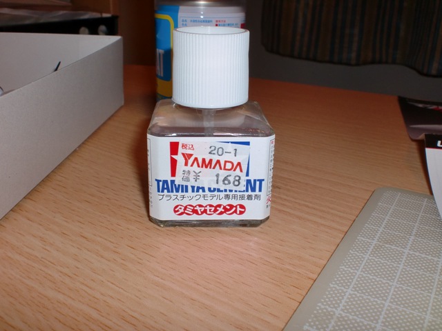 タミヤセメントです。かなり有名な接着剤だそうですね。この接着剤を塗ることでプラスチックが溶け、くっつけることが可能になるらしいです。